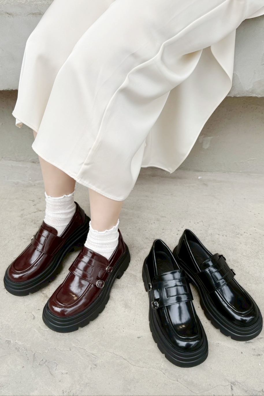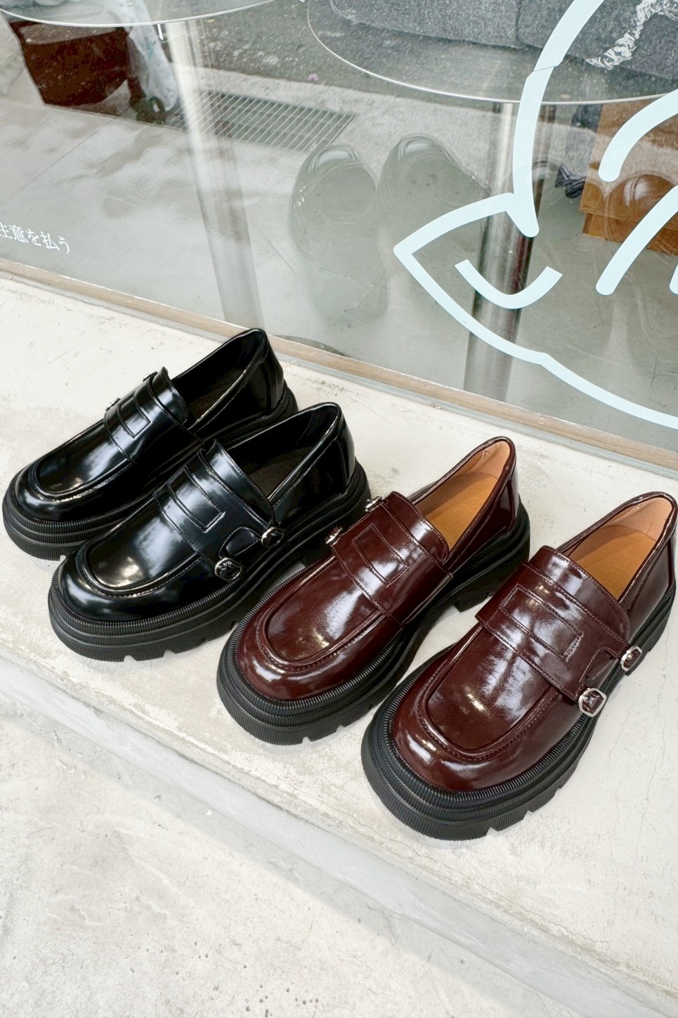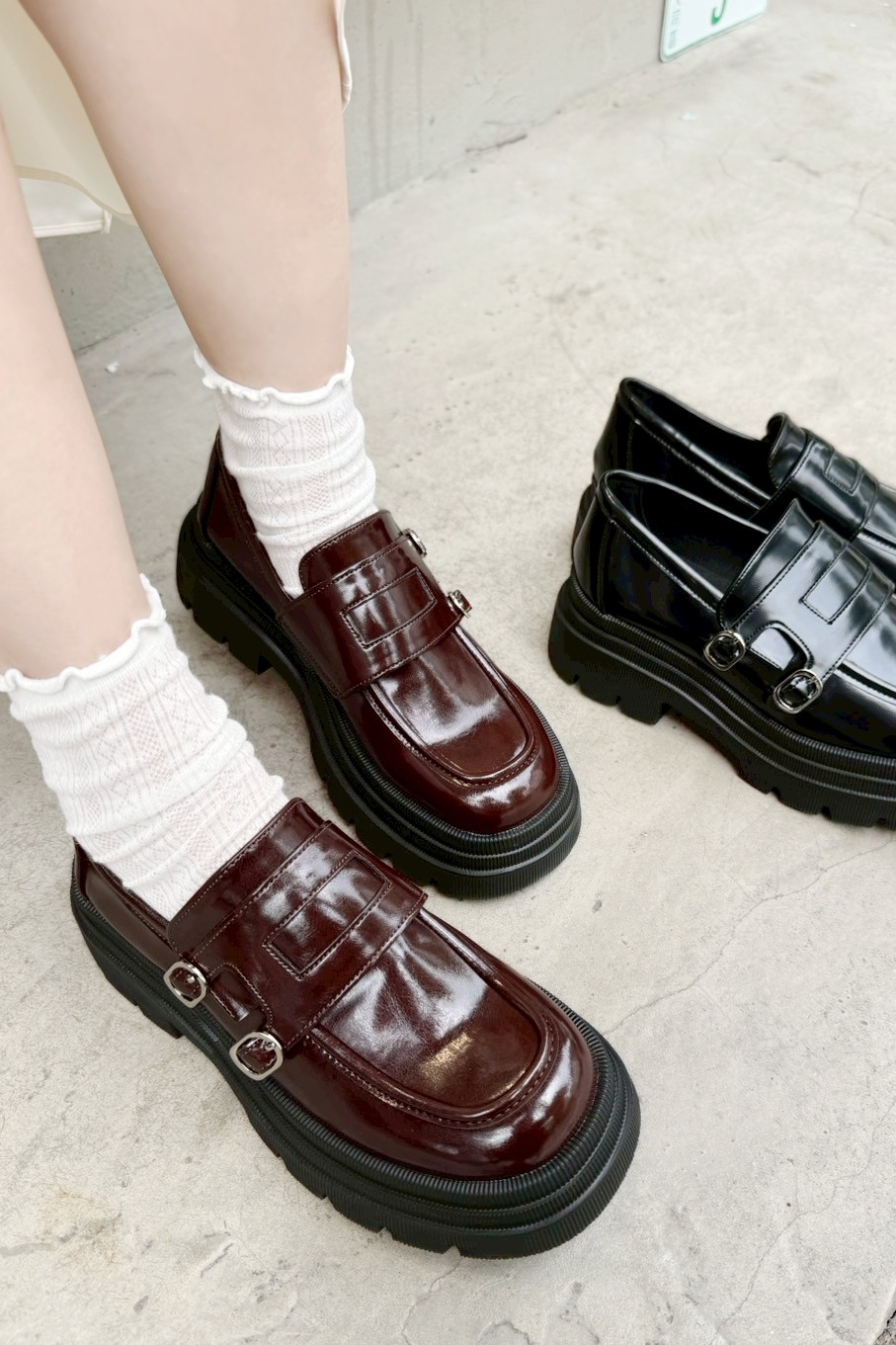輕盈厚底,結合微亮面皮革與雙扣設計,打造率性學院風格。