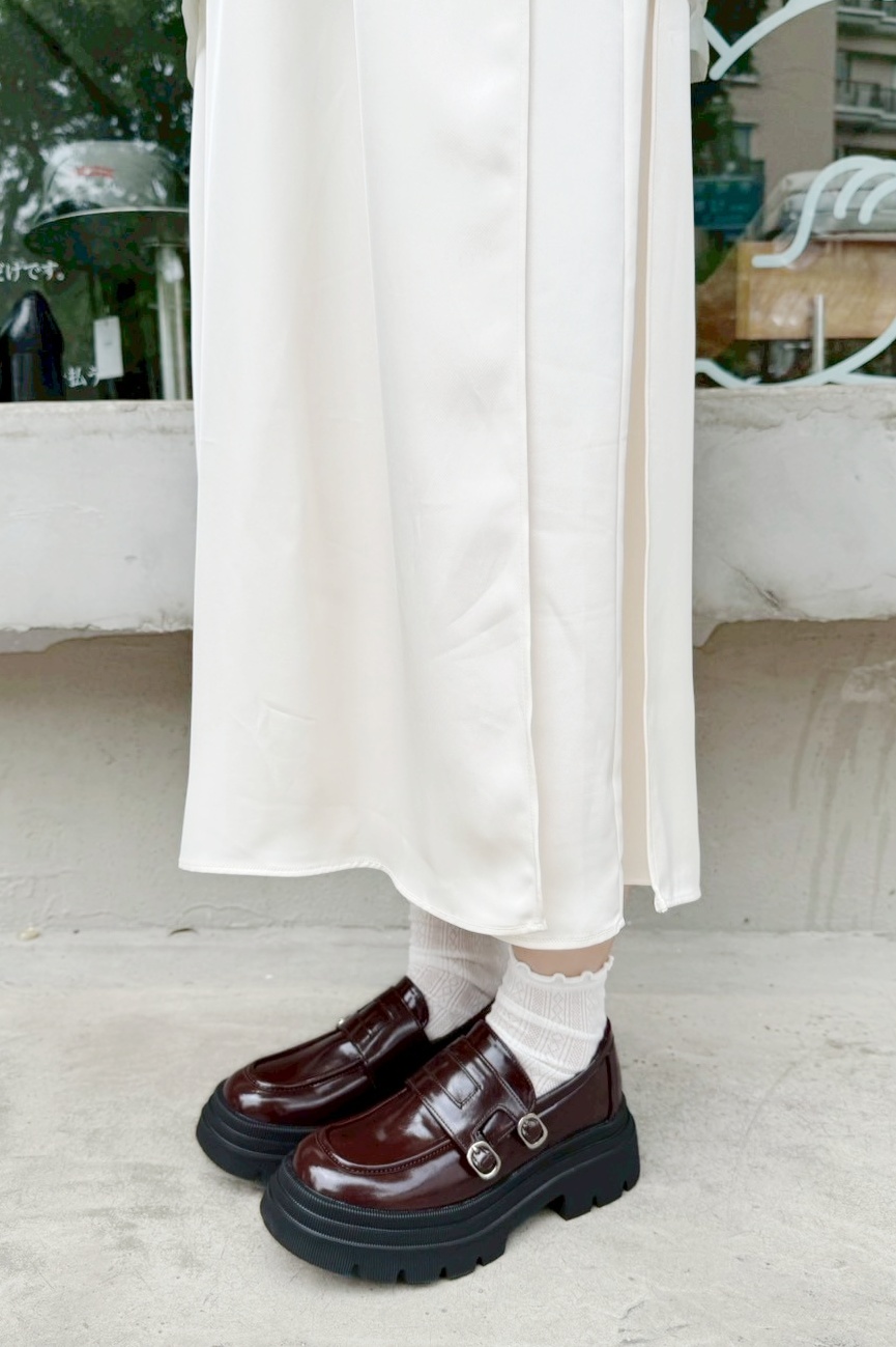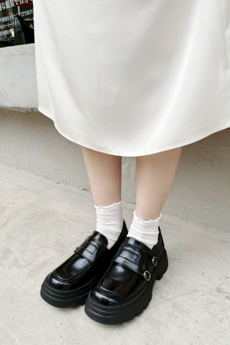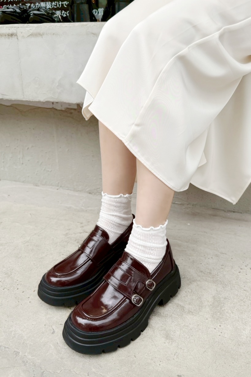 輕盈厚底,結合微亮面皮革與雙扣設計,打造率性學院風格。