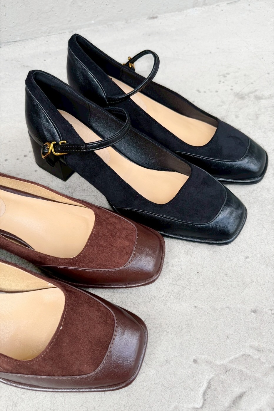 方頭絨布拼接瑪莉珍粗跟鞋