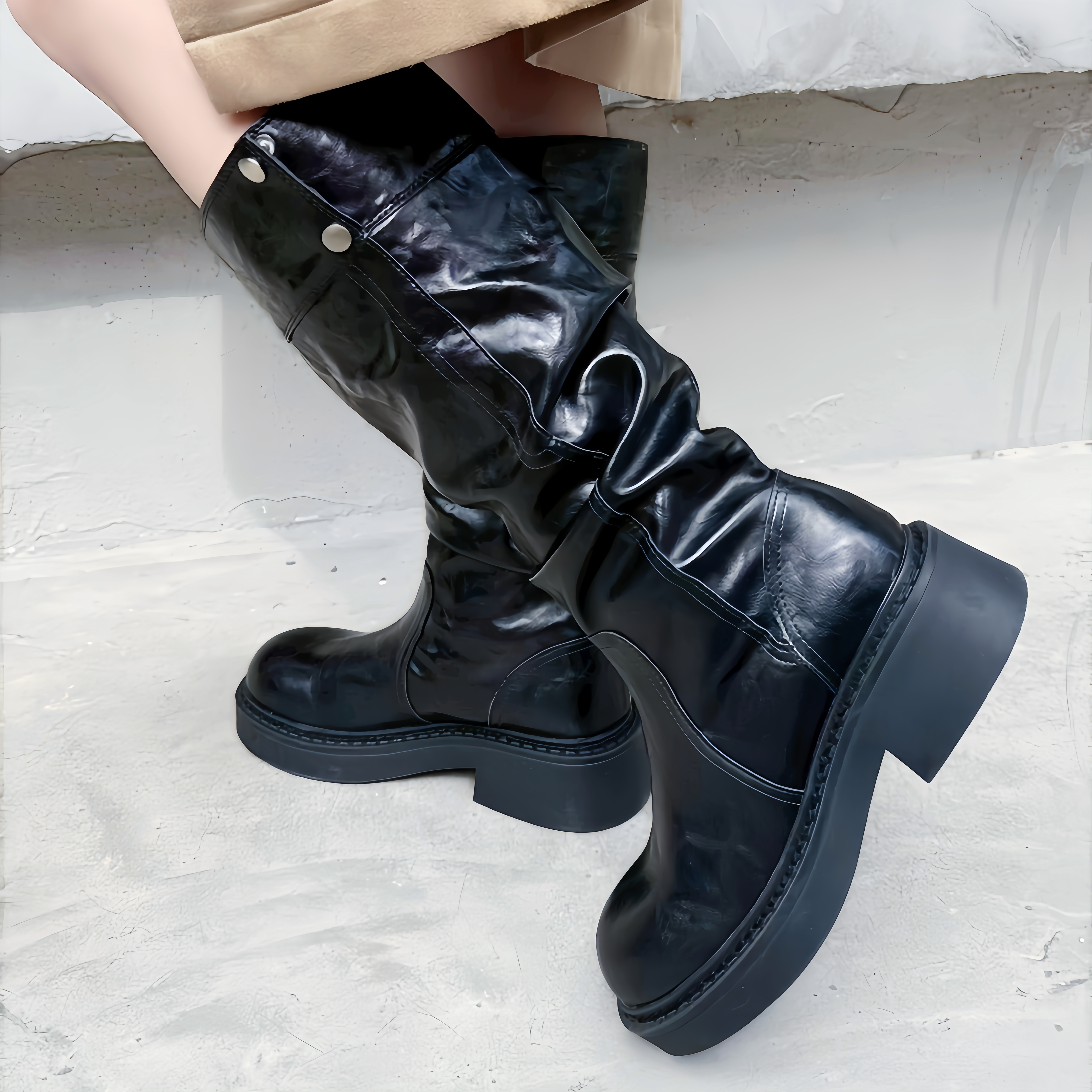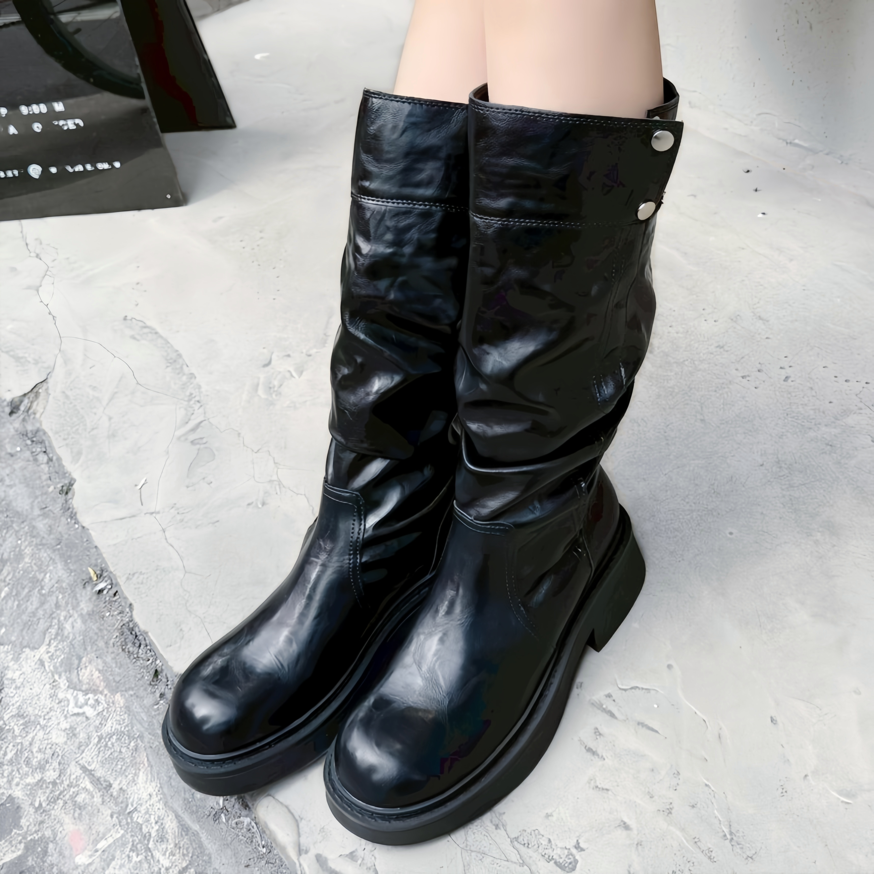 可翻折兩穿的筒口,皺褶皮料設計,整體可愛又復古。
