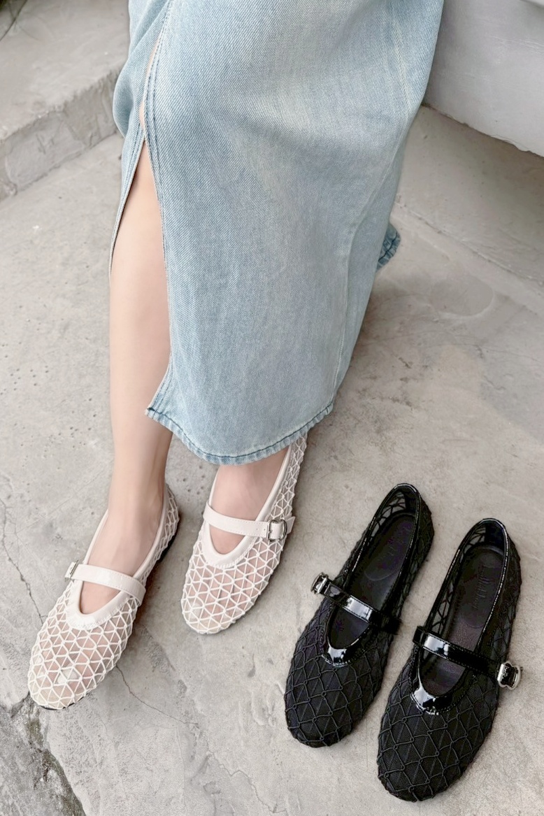 大尺碼透膚編織網面瑪莉珍平底鞋